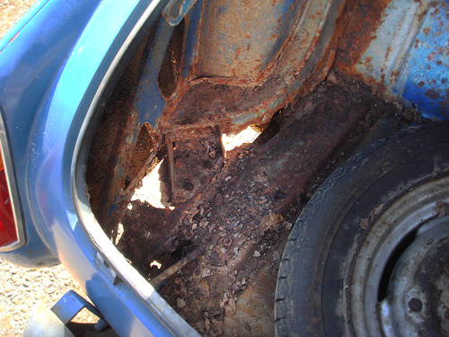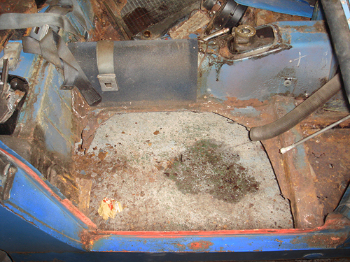 20 plus years sat in a garage with a damp floor had taken it's toll, look closely at the driver's side floor, yes that 3" gap between floor and sill is showing the ground! the boot floor is similarly non existent, this car will be our biggest rebuild to date and needs at a minimum, a complete floor pan, boot floor and chassis legs, inner wheel arches front and rear, rear heel board and spring mounts plus plenty more, on the bright side the Ashley front was not affected by the damp! |