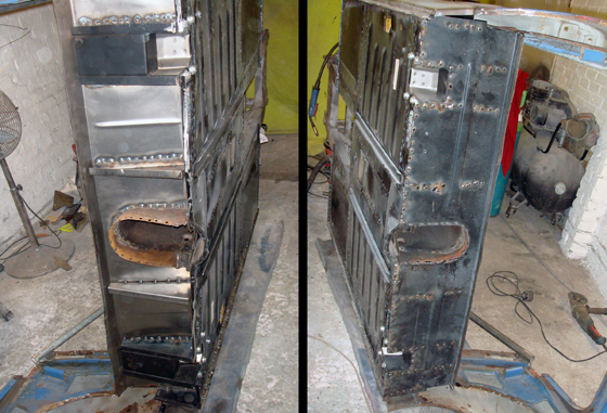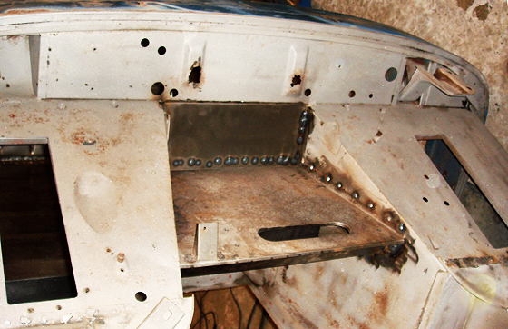 Rear heelboard panel welded in place, note the inner bracing, then with the underfloor outer skin welded in place, in effect sandwiching the bracing and creating a strong bulkhead |