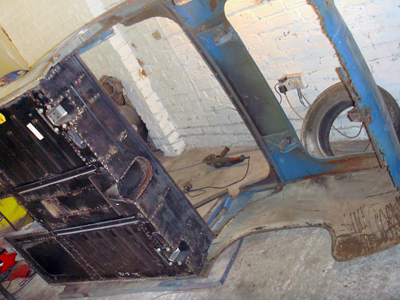 Complete boot floor and arches removed and un-spotwelded ready for the new major floor pan, arches and chassis legs |