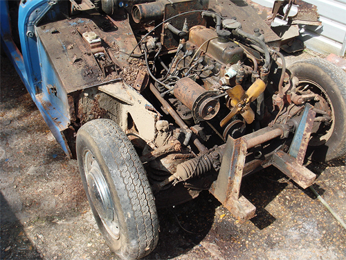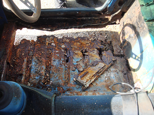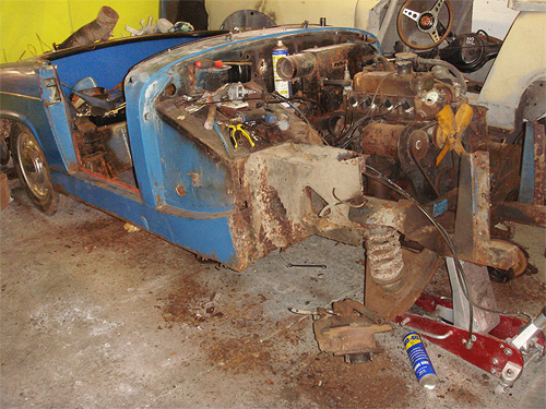 Car in process of being stripped back to a bare shell, here front suspension components are being removed. The rotten floor pan was removed to provide access to the gearbox mounting bolts without laying under car |